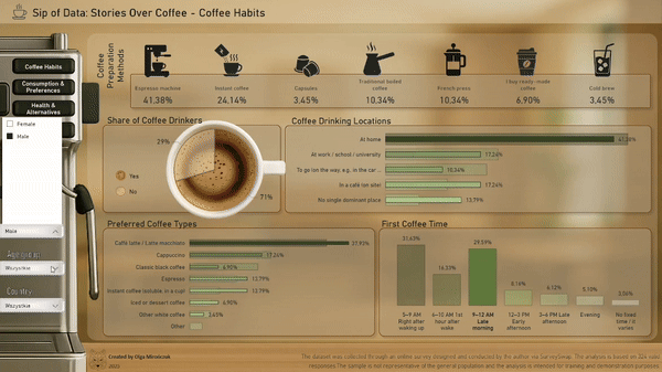Dashboard pokazuje zwyczaje związane z piciem kawy w prosty i przejrzysty sposób. Odpowiedzi w większości potwierdziły intuicje, ale wartością projektu było przekształcenie tych nawyków w liczby i umożliwienie ich porównania.
